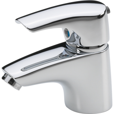 Tvättställsblandare med Eco-knapp som begränsar flöde och temperatur.